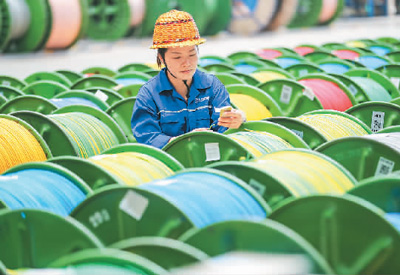 An employee checks cable products at the Deqing Smart Industrial Park of Zetastone Cable Co., Ltd. in Huzhou city, east China's Zhejiang Province. Since the beginning of this year, the city has supported enterprises in building intelligent workshops by using new-generation information technologies including 5G, big data and industrial internet. (Photo/Wang Shucheng)