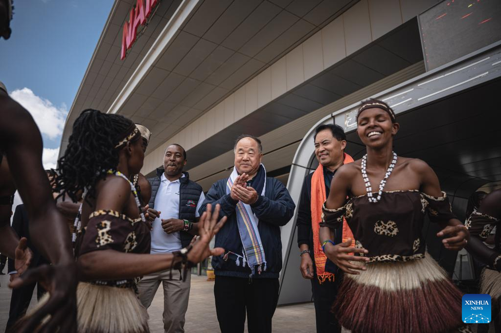 Mo Yan (1st R) interacts with performers at the Nairobi Station of the Mombasa-Nairobi Standard Gauge Railway in Nairobi, Kenya, Aug. 13, 2023. (Xinhua/Wang Guansen)