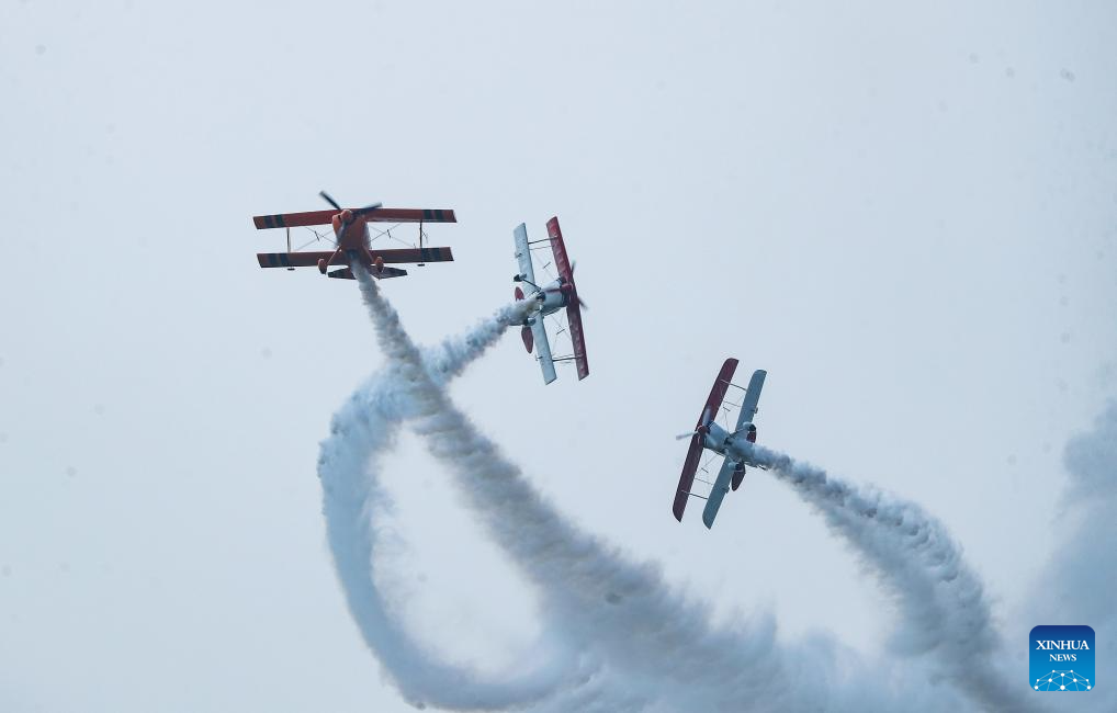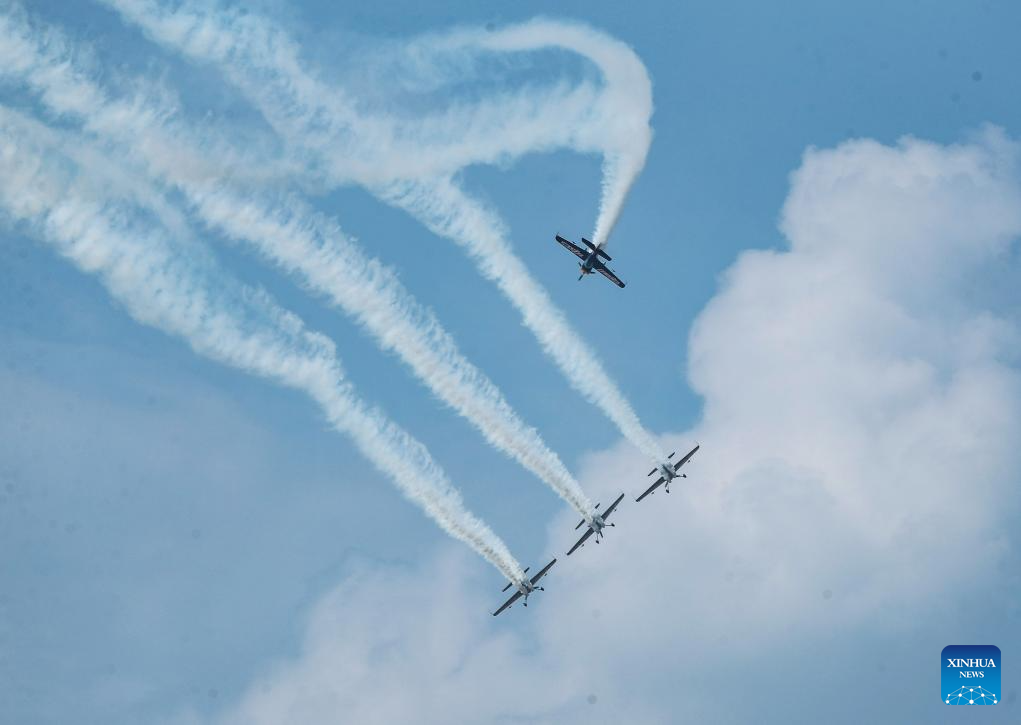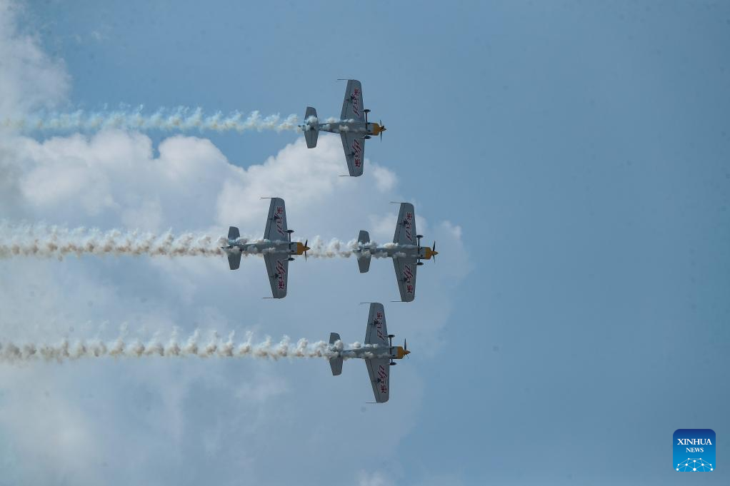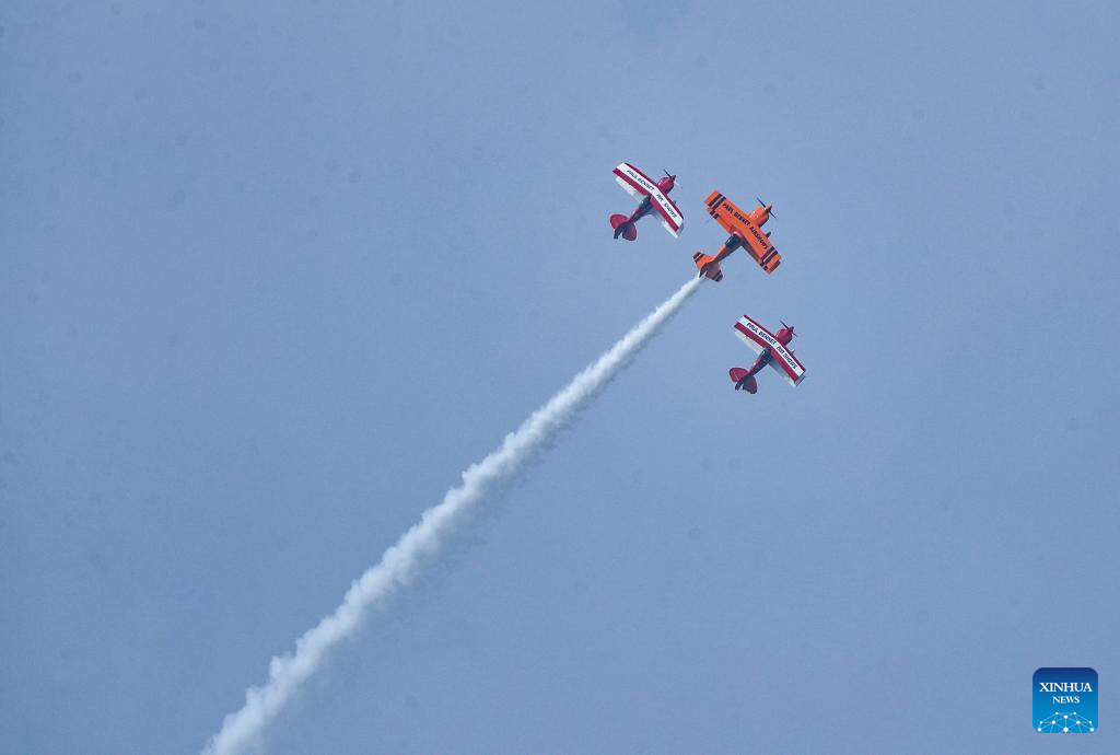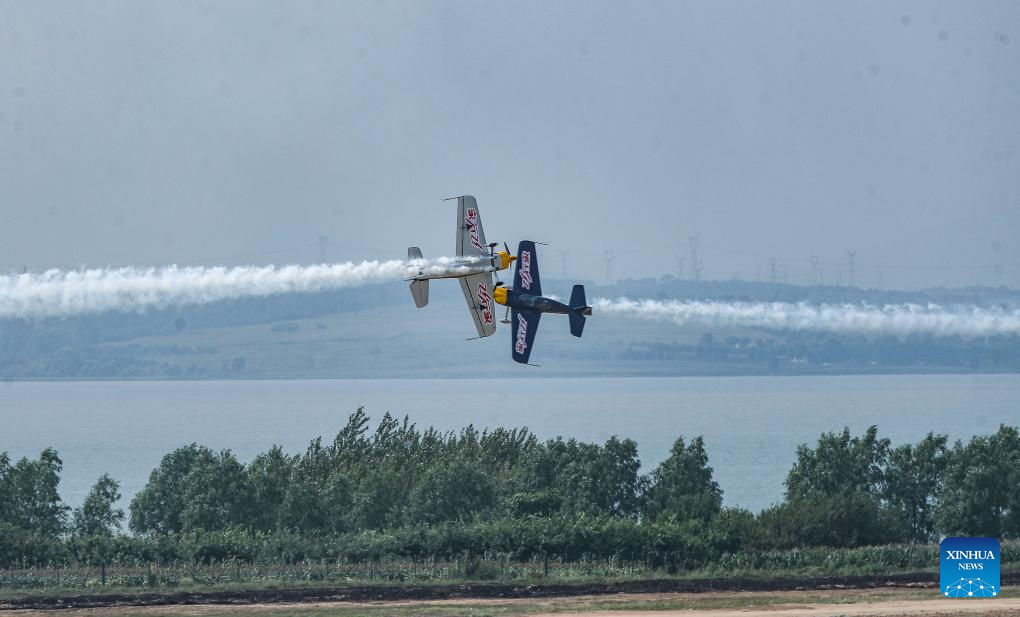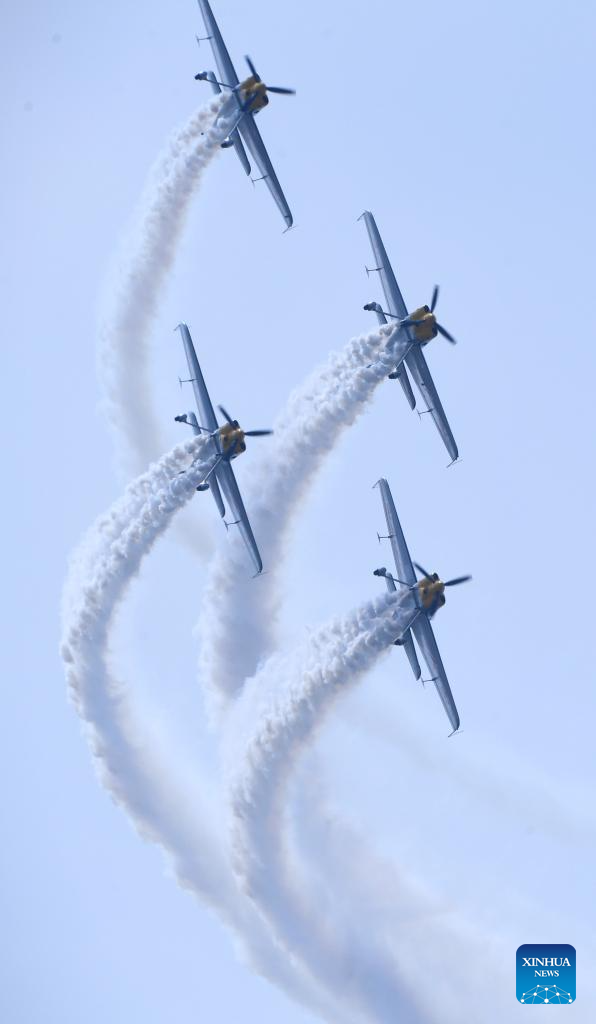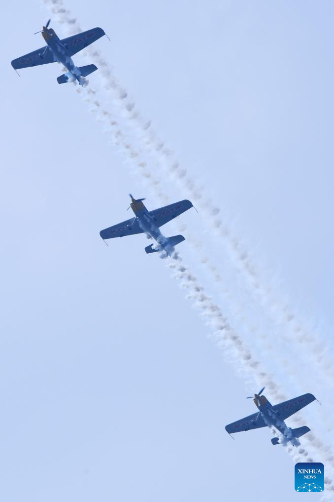 An aerobatic performance is staged during the opening ceremony of the 10th Faku Flight International Conference in Shenyang, northeast China's Liaoning Province, Aug. 18, 2023. (Xinhua/Chen Wei)