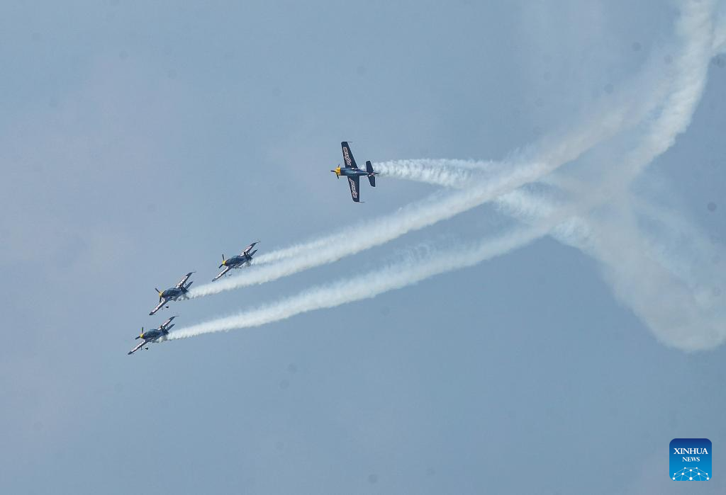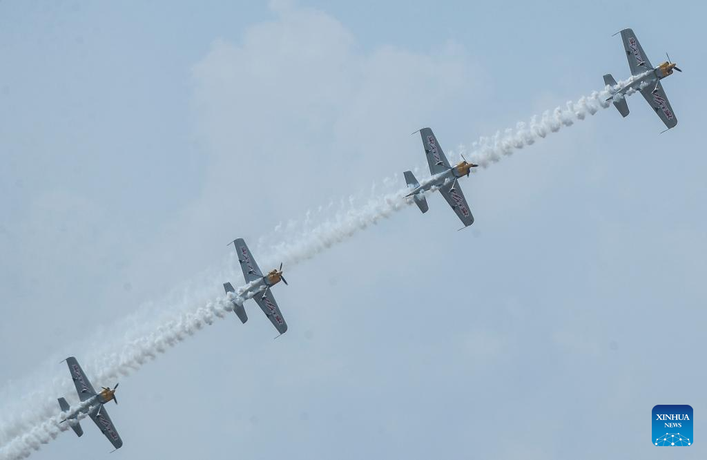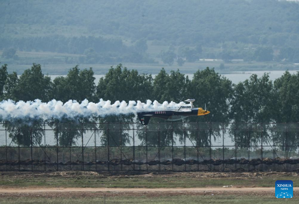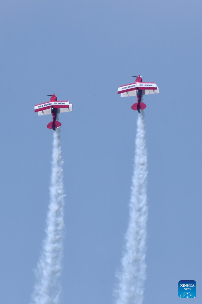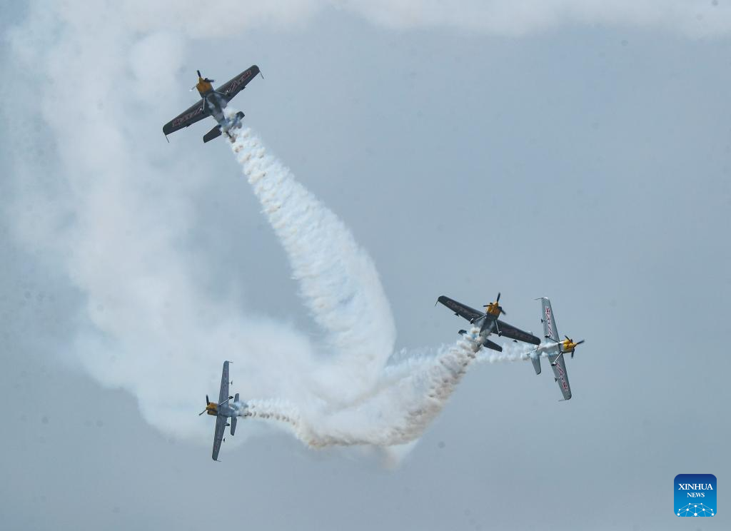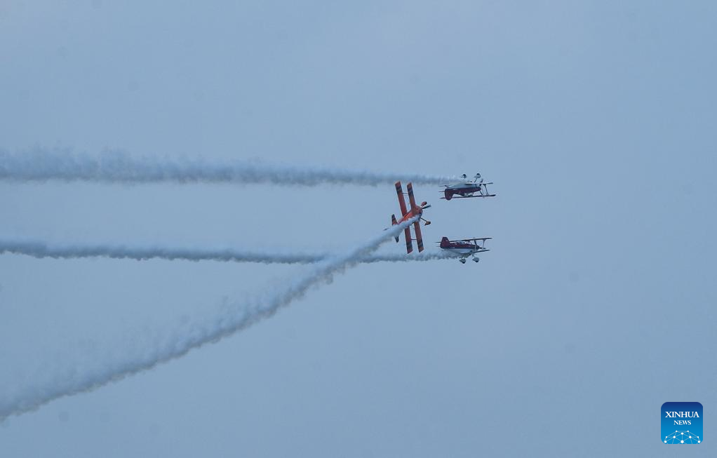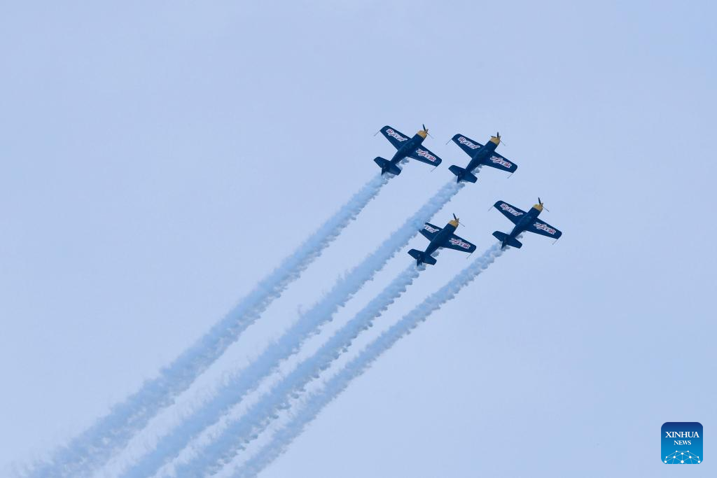 An aerobatic performance is staged during the opening ceremony of the 10th Faku Flight International Conference in Shenyang, northeast China's Liaoning Province, Aug. 18, 2023. (Xinhua/Chen Wei)