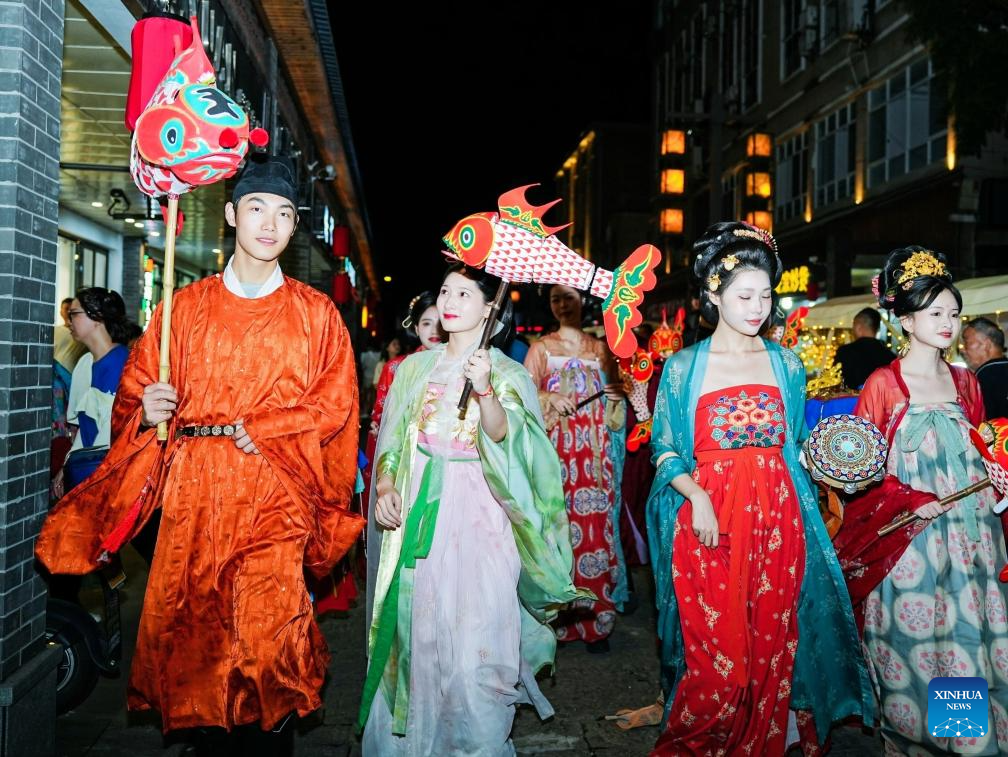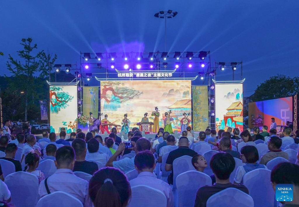 This photo taken on Aug. 18, 2023 shows the opening ceremony of a cultural festival in Changhua Town of Hangzhou City, east China's Zhejiang Province. The cultural festival, which kicked off Friday in Changhua Town, aimed to boost the nighttime economy by presenting the culture of Tang (618-907) and Song (960-1279) Dynasties and promoting local snacks and scenic spots. (Xinhua/Xu Yu)