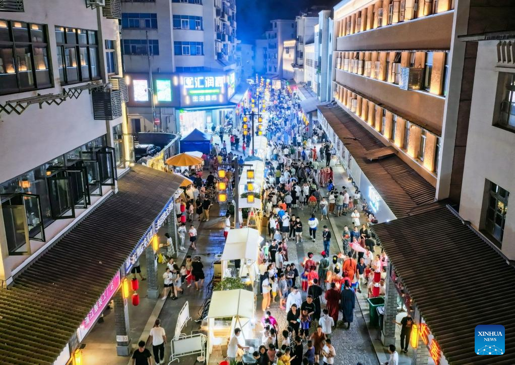This aerial photo taken on Aug. 18, 2023 shows tourists visiting a street during a cultural festival in Changhua Town of Hangzhou City, east China's Zhejiang Province. The cultural festival, which kicked off Friday in Changhua Town, aimed to boost the nighttime economy by presenting the culture of Tang (618-907) and Song (960-1279) Dynasties and promoting local snacks and scenic spots. (Xinhua/Xu Yu)