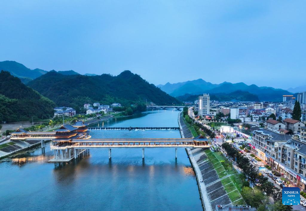 This aerial photo taken on Aug. 18, 2023 shows a view of Changhua river in Changhua Town of Hangzhou City, east China's Zhejiang Province. The cultural festival, which kicked off Friday in Changhua Town, aimed to boost the nighttime economy by presenting the culture of Tang (618-907) and Song (960-1279) Dynasties and promoting local snacks and scenic spots. (Xinhua/Xu Yu)