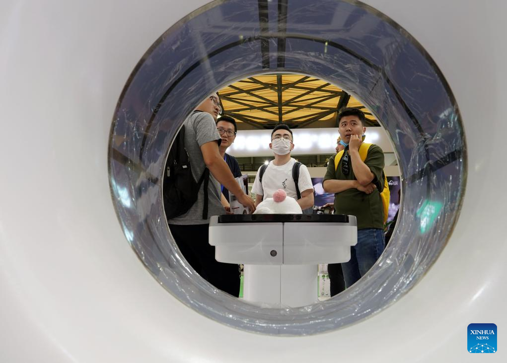 A CT scanner specially designed for animal is pictured at the 25th Pet Fair Asia in east China's Shanghai, Aug. 16, 2023. The five-day pet fair opened at the Shanghai New International Expo Center (SNIEC) Wednesday, attracting over 2,000 exhibitors. (Xinhua/Liu Ying)