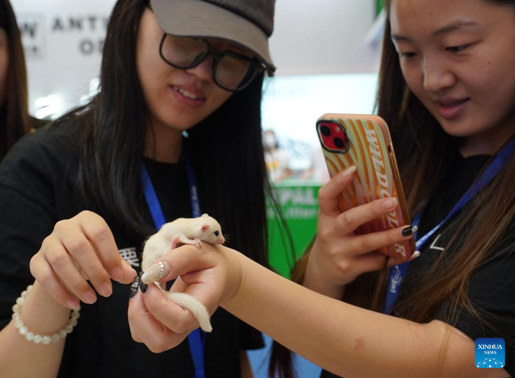 People interact with a sugar glider during the 25th Pet Fair Asia in east China's Shanghai, Aug. 16, 2023. The five-day pet fair opened at the Shanghai New International Expo Center (SNIEC) Wednesday, attracting over 2,000 exhibitors. (Xinhua/Liu Ying)