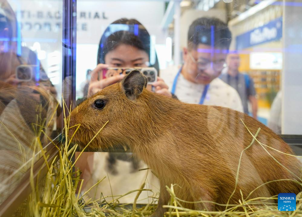 A capybara is pictured during the 25th Pet Fair Asia in east China's Shanghai, Aug. 16, 2023. The five-day pet fair opened at the Shanghai New International Expo Center (SNIEC) Wednesday, attracting over 2,000 exhibitors. (Photo by Li Xinyi/Xinhua)