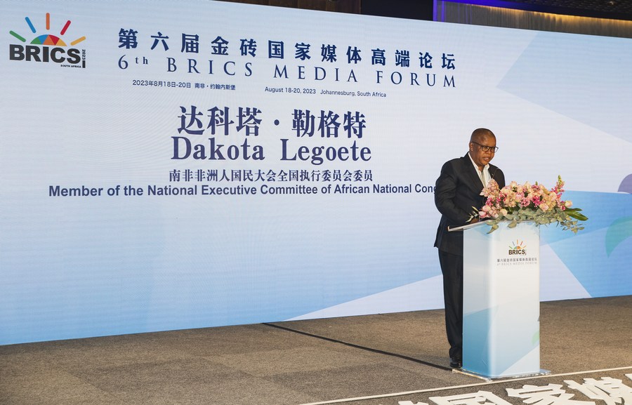 Dakota Legoete, a member of the National Executive Committee of the African National Congress, speaks at the opening ceremony of the Sixth BRICS Media Forum in Johannesburg, South Africa, Aug. 19, 2023. (Xinhua/Zhang Yudong)