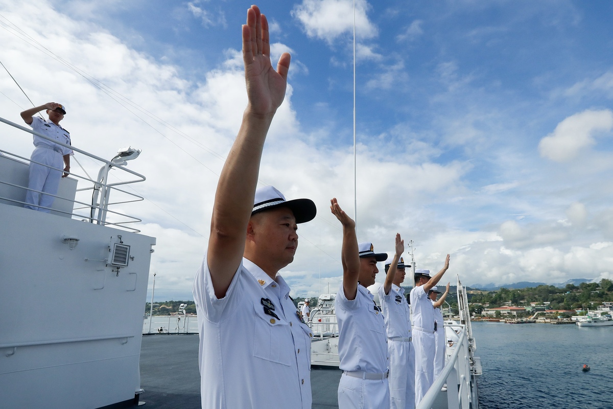Crew members of the Chinese naval hospital ship "Peace Ark" wave to the welcoming crowd on Aug 19, 2023. [Photo by Xu Wei/For chinadaily.com.cn]