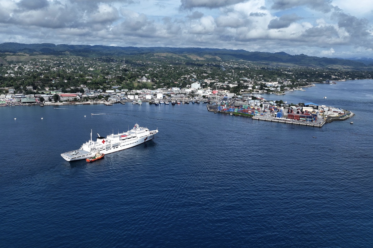 The Chinese naval hospital ship "Peace Ark" arrives at Honiara Port in the Solomon Islands on Aug 19, 2023. [Photo by Gui Jiangbo/For chinadaily.com.cn]