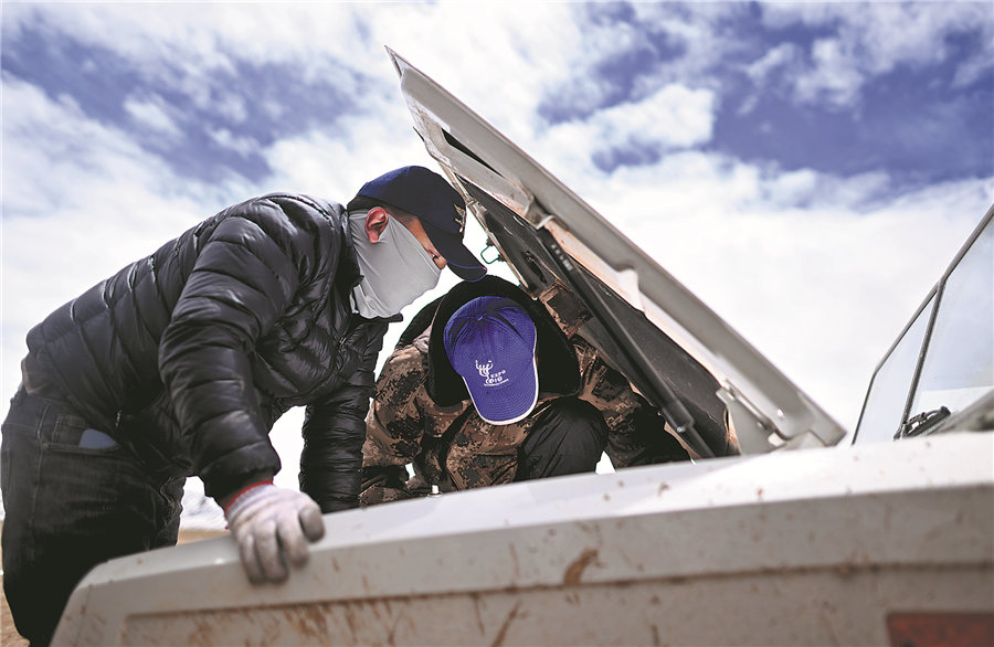Two rangers examine a vehicle's engine during a recent patrol in Hoh Xil, which is located in Sanjiangyuan National Park in Northwest China's Qinghai province. ZHANG HONGXIANG/XINHUA