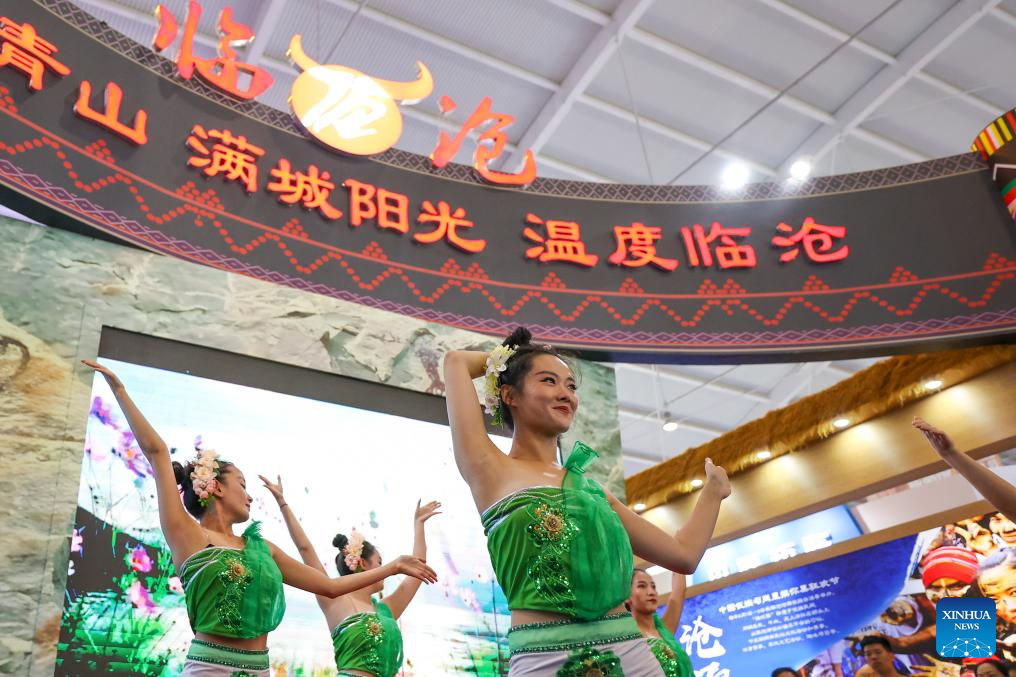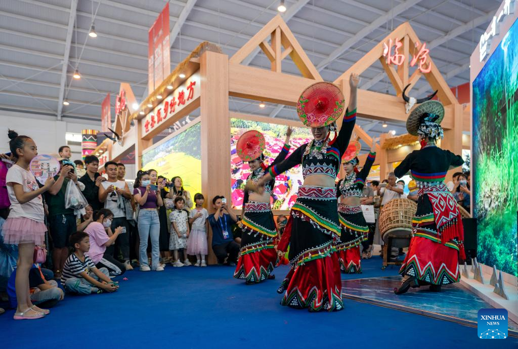 Artists perform in the Culture and Tourism Pavilion at the seventh China-South Asia Expo in Kunming, southwest China's Yunnan Province, Aug. 19, 2023. The ongoing seventh China-South Asia Expo has attracted more than 30,000 exhibitors, representatives, and guests from 85 countries and regions to attend online and offline. (Xinhua/Hu Chao)