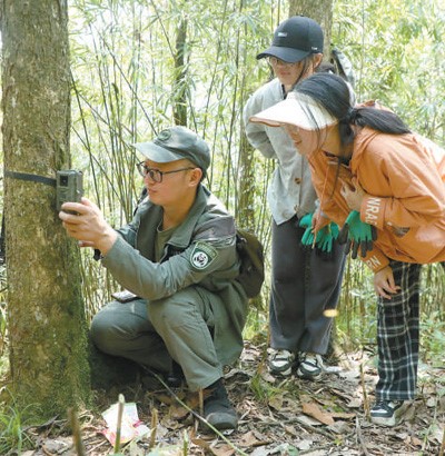 A ranger with Sichuan Daxiangling Feralization and Reintroduction Base in Ya'an city, southwest China's Sichuan province, installs and adjusts an infrared camera. (Photo/Yang Ailing)