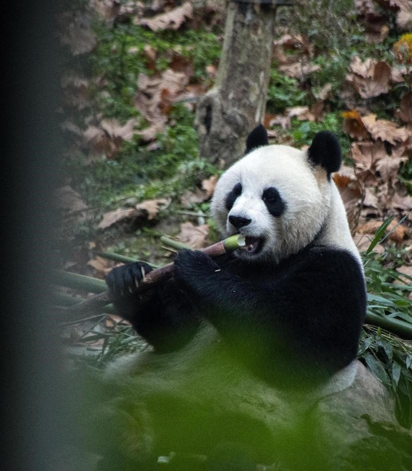 A giant panda enjoys bamboos at Bifengxia base of the China Conservation and Research Center for Giant Panda in Ya'an city, southwest China's Sichuan province. (People's Daily Online/Zhou Xiujian)