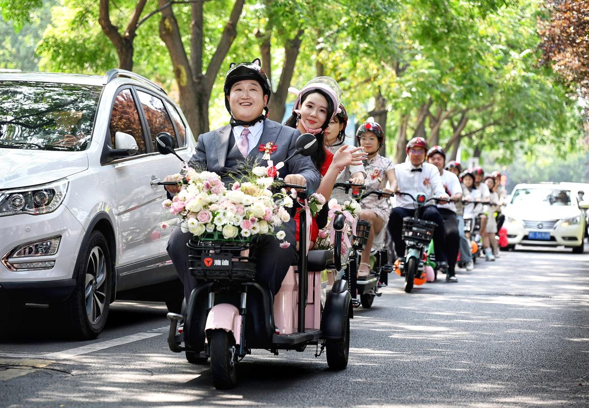 Groom in C China's Luoyang picks up bride with electric moped fleet (4)