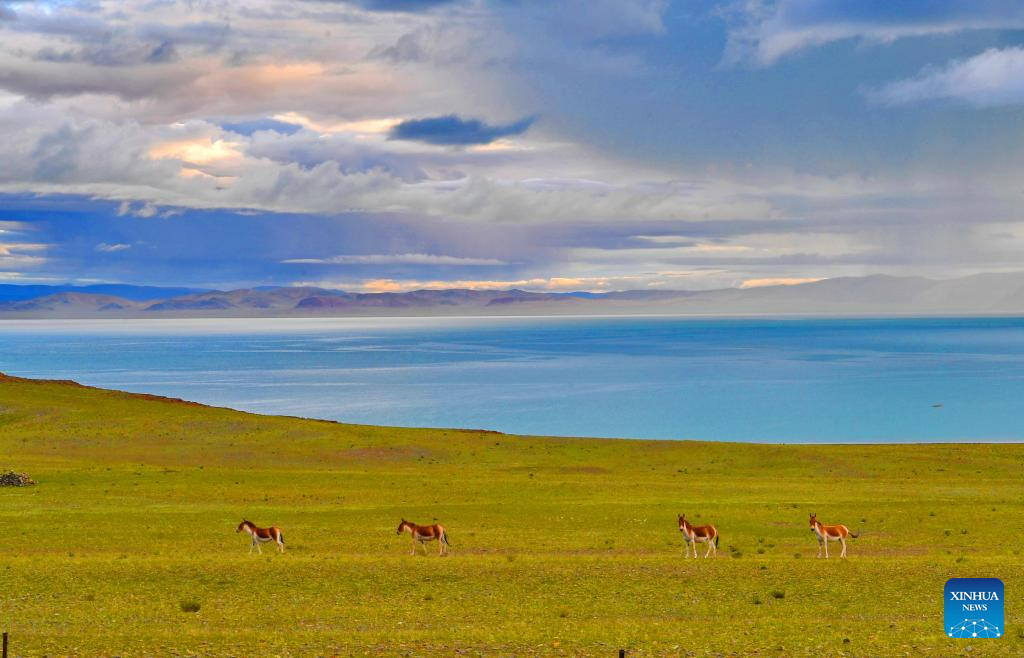 This photo taken on Aug. 19, 2023 shows Tibetan wild donkeys at Zhari Namco Lake in Ali, southwest China's Tibet Autonomous Region. (Xinhua/Zhang Rufeng)