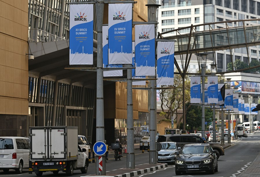 Signboards of the 15th BRICS summit are seen on a street of Johannesburg, South Africa, Aug. 17, 2023. (Xinhua/Chen Cheng)
