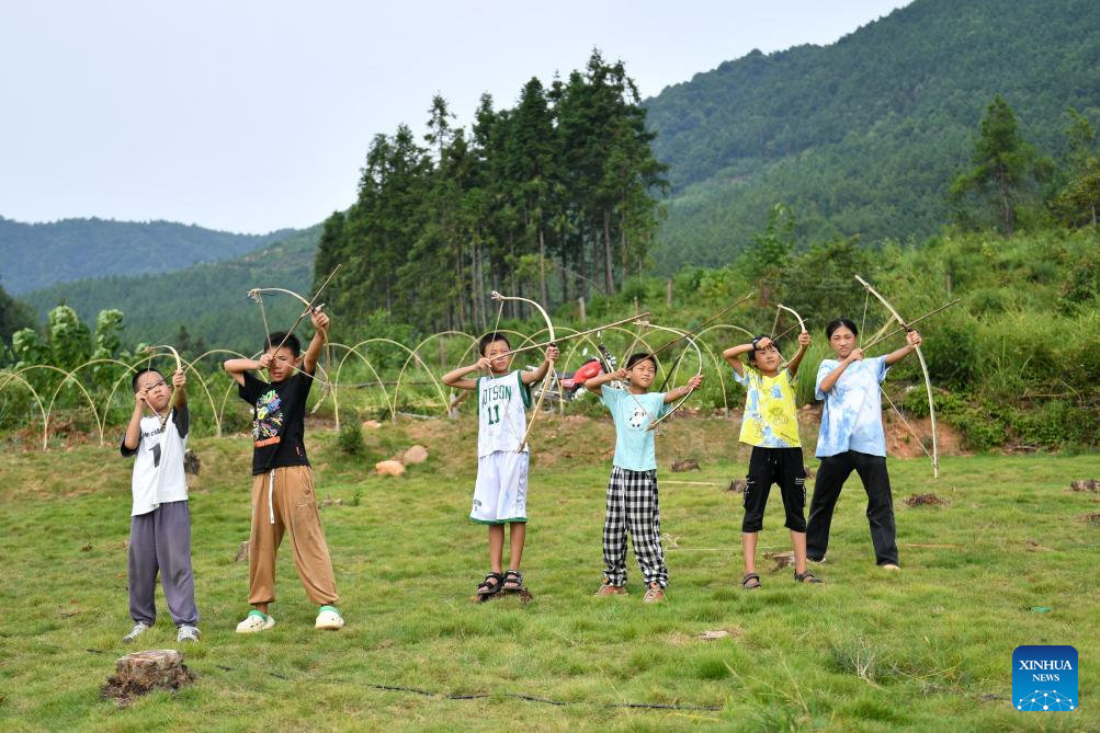 Children try the toy bows and arrows made by themselves in Ningyuan County of central China's Hunan Province, Aug. 19, 2023. (Xinhua/Chen Zhenhai)?