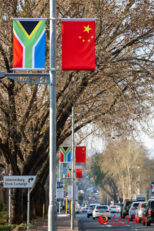 Photo taken on Aug. 21, 2023 shows the national flags of China and South Africa along a street in Johannesburg, South Africa. Chinese President Xi Jinping arrived in South Africa on Monday to attend the 15th BRICS Summit and pay a state visit to South Africa. (People's Daily Online/Weng Qiyu)