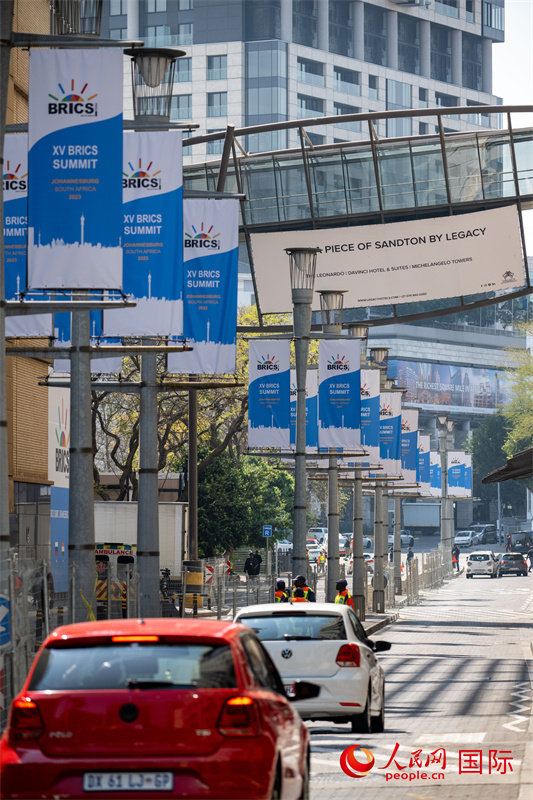 Photo taken on Aug. 21, 2023 shows banners for the 15th BRICS Summit, which is slated to run from Aug. 22 to 24 in Johannesburg, South Africa. Chinese President Xi Jinping arrived in South Africa on Monday to attend the 15th BRICS Summit and pay a state visit to South Africa. (People's Daily Online/Weng Qiyu)