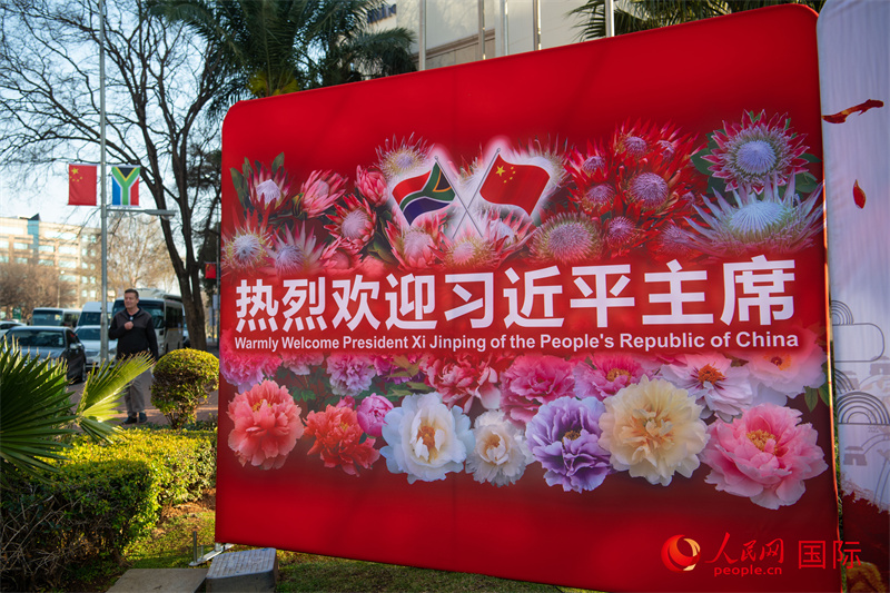 Photo taken on Aug. 21, 2023 shows a Chinese-English bilingual welcome sign that says, "Warmly Welcome President Xi Jinping of the People's Republic of China" in a street in Johannesburg, South Africa. Chinese President Xi Jinping arrived in South Africa on Monday to attend the 15th BRICS Summit and pay a state visit to South Africa. (People's Daily Online/Weng Qiyu)