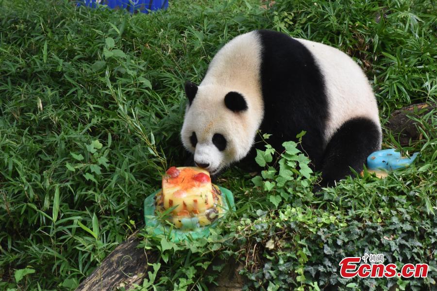 Giant panda cub Xiao Qi Ji celebrates its 3rd birthday with an ice cake at Smithsonian's National Zoo in Washington, D.C., the United States, Aug. 21, 2023. (Photo: China News Service/Sha Hanting)