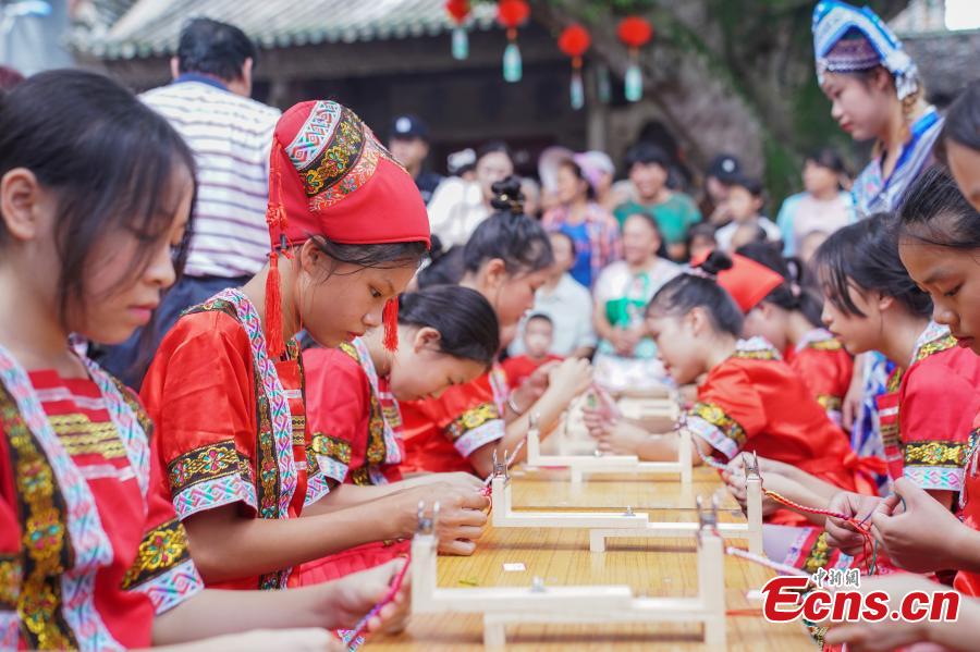 Students weave during "Saiqiao Festival", a celebration of the Qixi Festival in Nanning, south China's Guangxi Zhuang Autonomous Region, Aug. 21, 2023. (Photo: China News Service/Chen Guanyan)