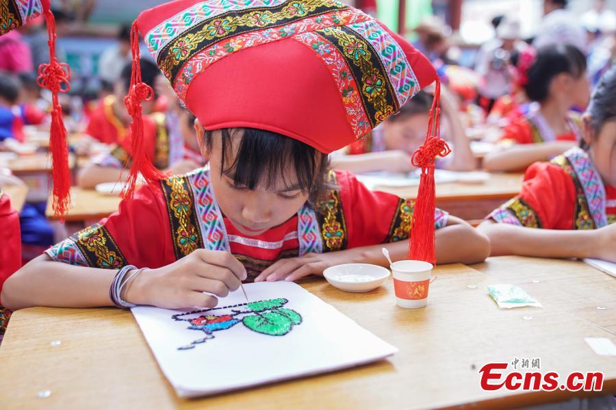 Children make rice drawings during "Saiqiao Festival", a celebration of the Qixi Festival in Nanning, south China's Guangxi Zhuang Autonomous Region, Aug. 21, 2023. (Photo: China News Service/Chen Guanyan)