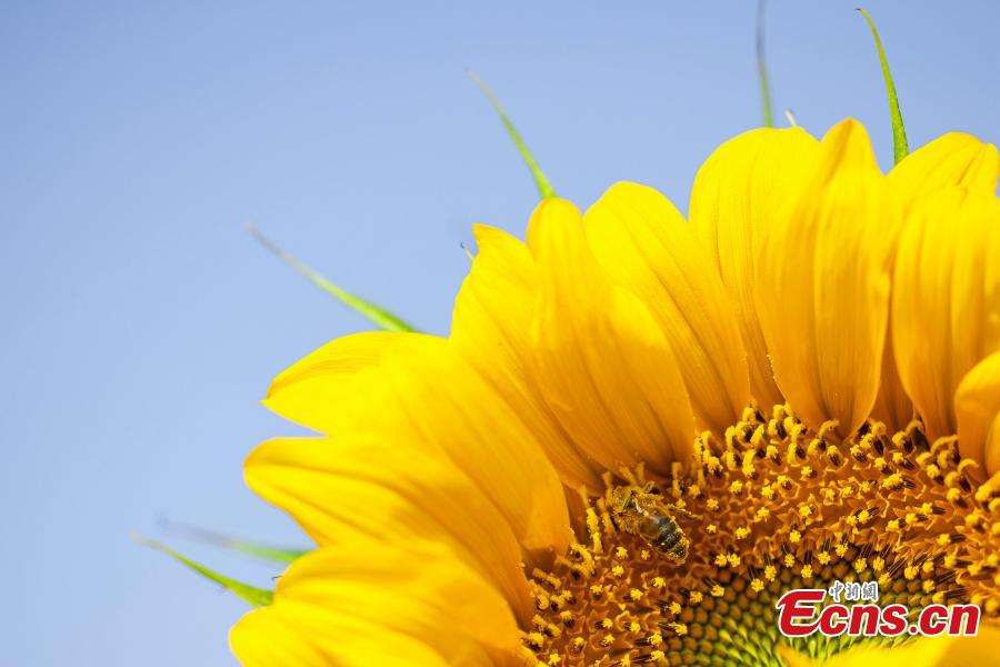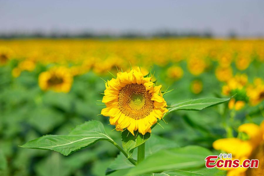 Blooming sunflowers facing the sun sway in the breeze in Togtoh County, north China's Inner Mongolia Autonomous Region. (Photo/China News Service)