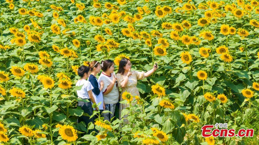 Tourists pose for photos in a sea of blooming sunflowers in Togtoh County, north China's Inner Mongolia Autonomous Region. (Photo/China News Service)
