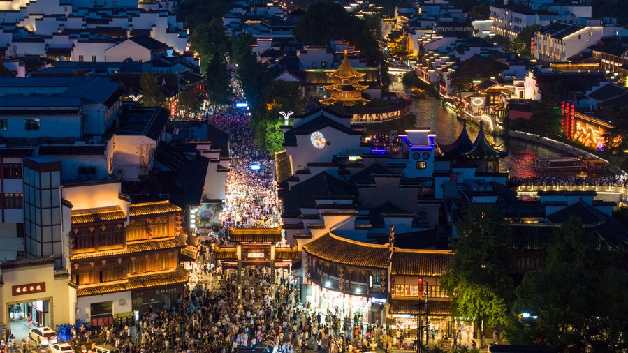 NANJING, Aug. 22 (Xinhua) -- Qinhuai District of Nanjing, capital of east China's Jiangsu Province, has been boosting and diversifying its tourism economy in recent years through joint efforts in entertainment, sightseeing, catering and shopping services. A number of tourist attractions designed for nighttime visit were established there to enrich the nightlife of both tourists and local residents, and infuse new vigor into urban consumption.