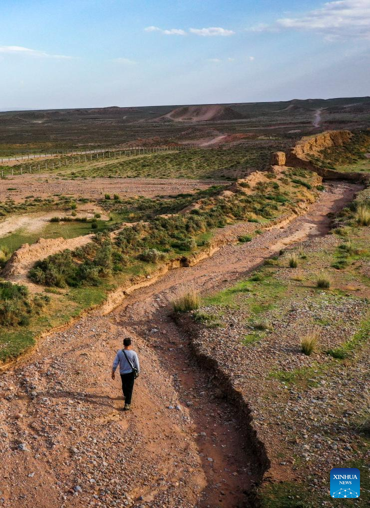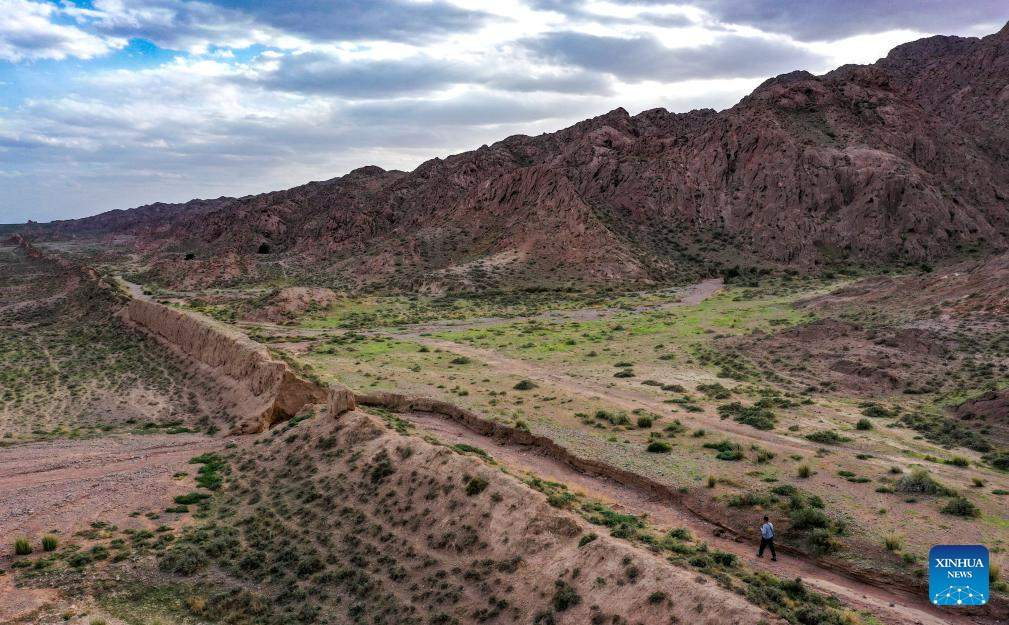 This aerial photo taken on Aug. 20, 2023 shows Dong Haining patrolling a section of the Great Wall built in Ming Dynasty (1368-1644) in north China. Dong Haining, 42, has been a protector of the Great Wall since 2016. Over the years, he has patrolled a section of the Great Wall located in the Helan Mountains while clearing rubbish and weeds, and reminding tourists to preserve the wall. (Xinhua/Feng Kaihua)