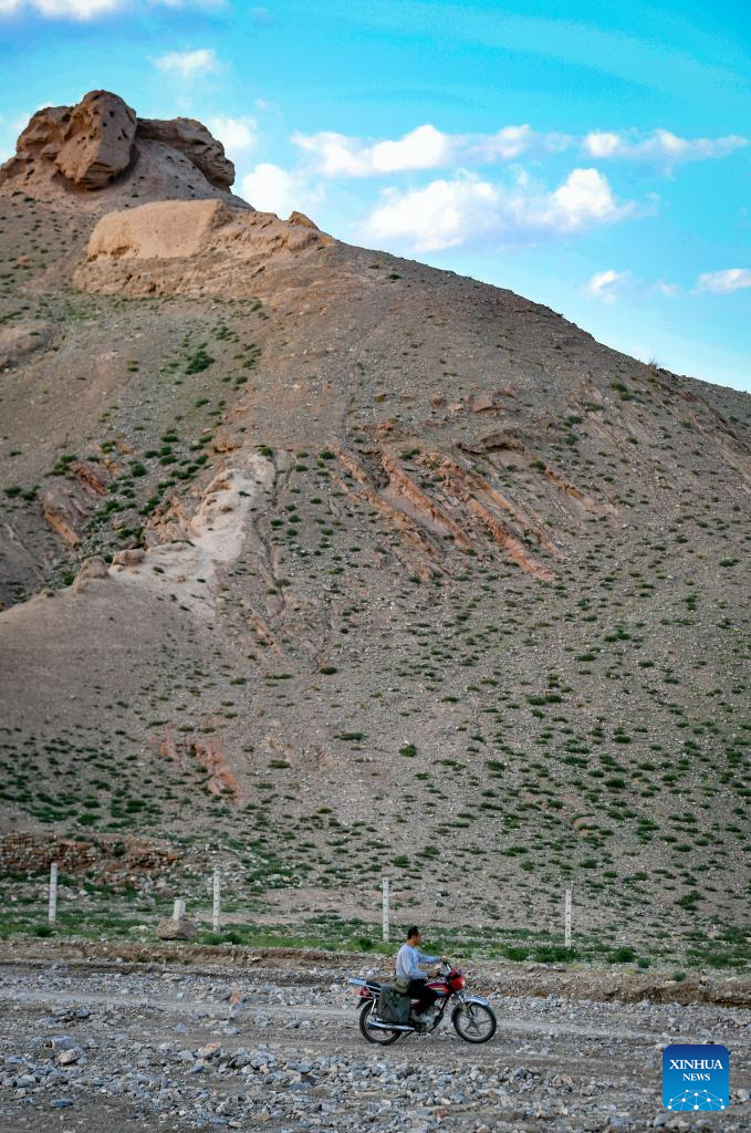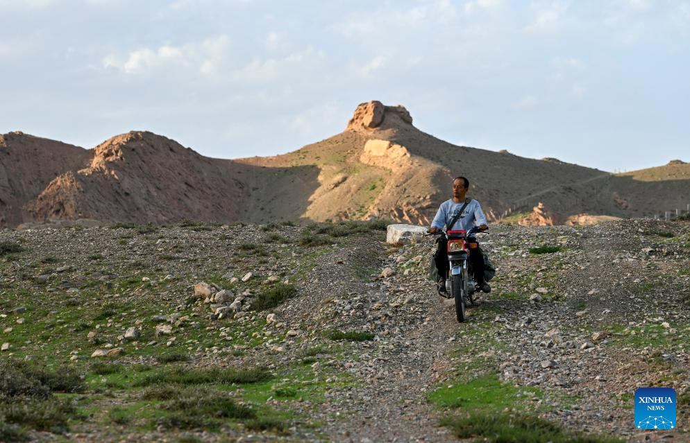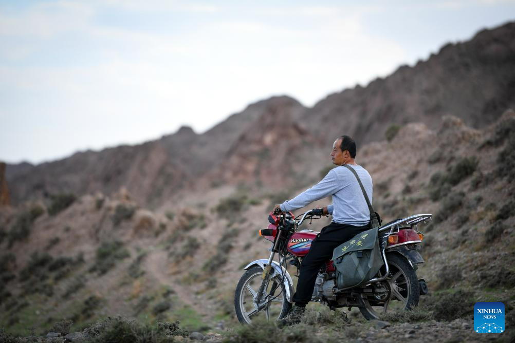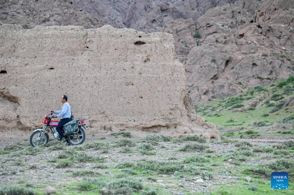 Dong Haining rides a motorcycle while patrolling a section of the Great Wall built in Ming Dynasty (1368-1644) in north China, Aug. 20, 2023. Dong Haining, 42, has been a protector of the Great Wall since 2016. Over the years, he has patrolled a section of the Great Wall located in the Helan Mountains while clearing rubbish and weeds, and reminding tourists to preserve the wall. (Xinhua/Feng Kaihua)