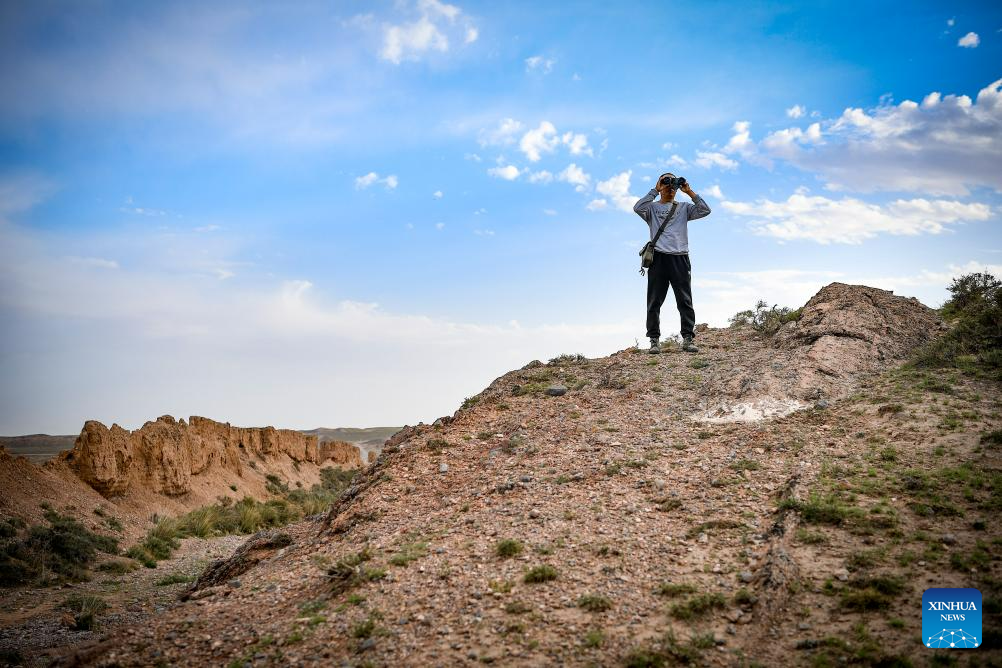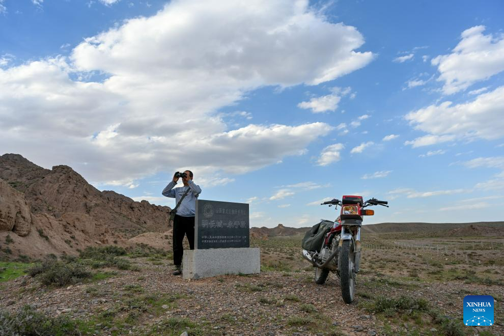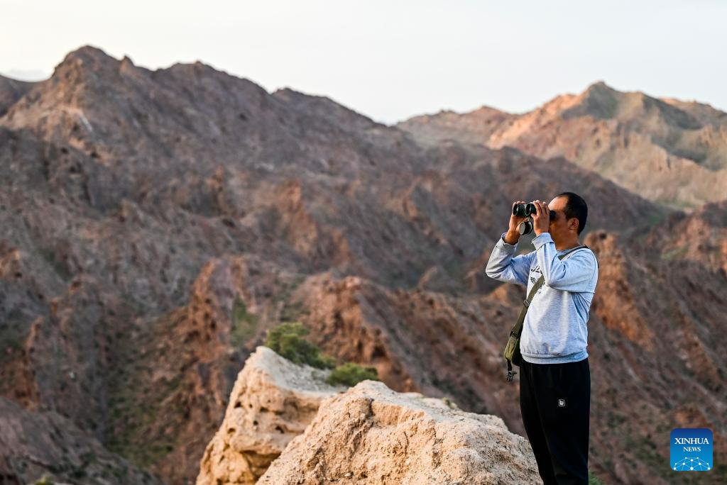 Dong Haining uses binoculars to observe a section of the Great Wall in north China, Aug. 20, 2023. Dong Haining, 42, has been a protector of the Great Wall since 2016. Over the years, he has patrolled a section of the Great Wall located in the Helan Mountains while clearing rubbish and weeds, and reminding tourists to preserve the wall. (Xinhua/Feng Kaihua)