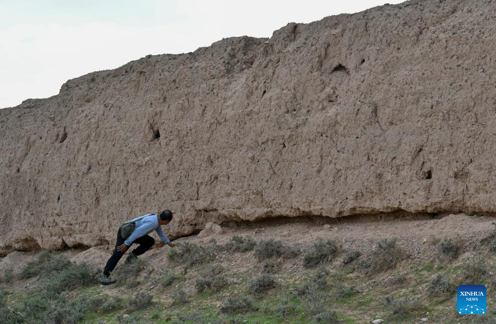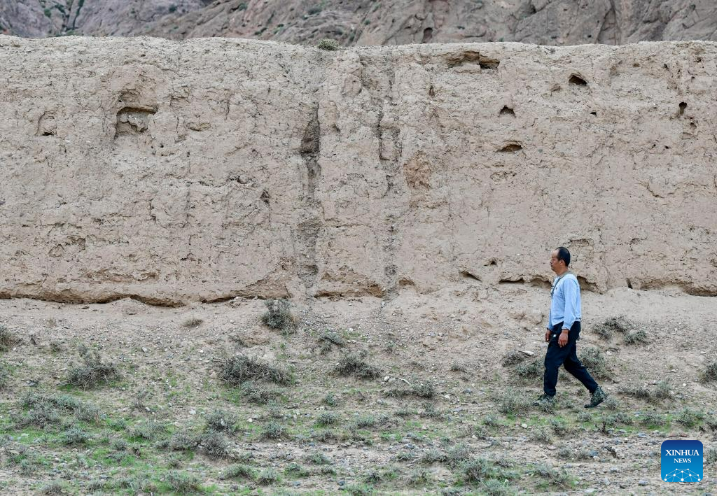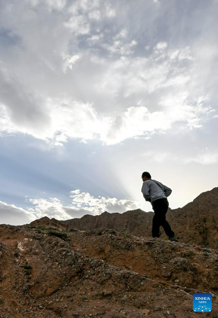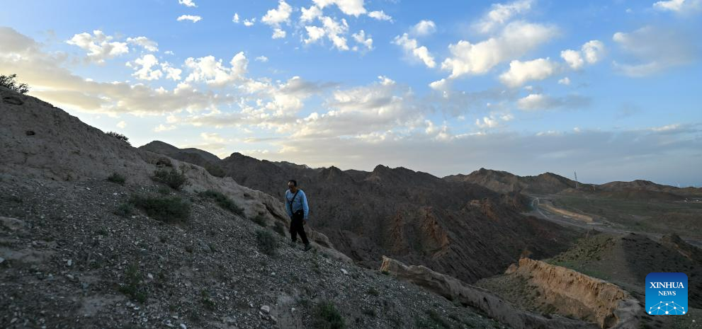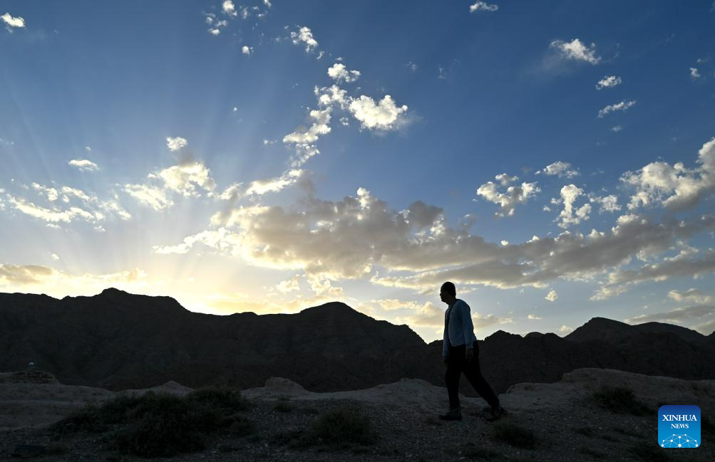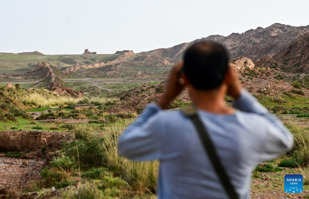 Dong Haining observes a section of the Great Wall built in Ming Dynasty (1368-1644) in north China, Aug. 20, 2023. Dong Haining, 42, has been a protector of the Great Wall since 2016. Over the years, he has patrolled a section of the Great Wall located in the Helan Mountains while clearing rubbish and weeds, and reminding tourists to preserve the wall. (Xinhua/Feng Kaihua)