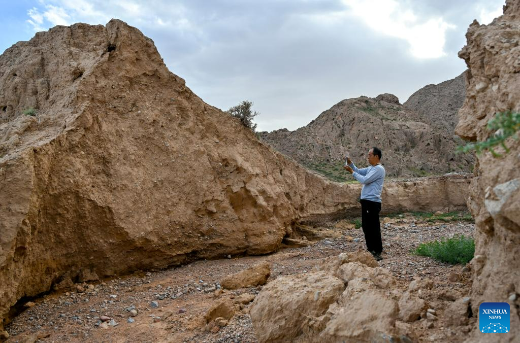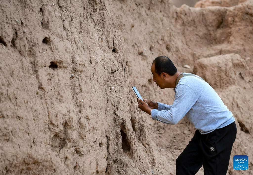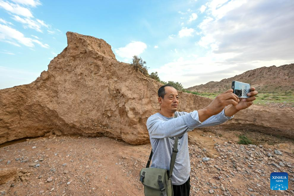Dong Haining takes photos while patrolling a section of the Great Wall built in Ming Dynasty (1368-1644) in north China, Aug. 20, 2023. Dong Haining, 42, has been a protector of the Great Wall since 2016. Over the years, he has patrolled a section of the Great Wall located in the Helan Mountains while clearing rubbish and weeds, and reminding tourists to preserve the wall. (Xinhua/Lian Zhen)