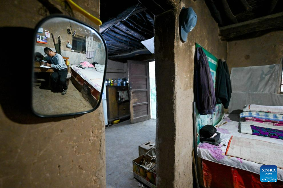 Dong Haining writes records at home after patrolling a section of the Great Wall in north China, Aug. 20, 2023. Dong Haining, 42, has been a protector of the Great Wall since 2016. Over the years, he has patrolled a section of the Great Wall located in the Helan Mountains while clearing rubbish and weeds, and reminding tourists to preserve the wall. (Xinhua/Liu Jinhai)