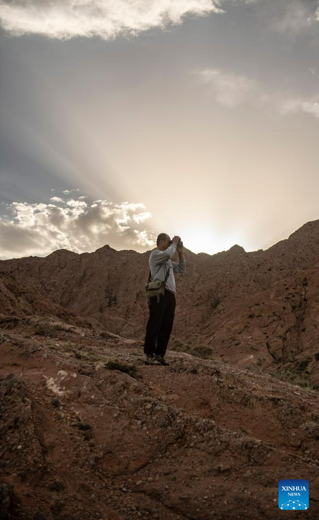 Dong Haining observes a section of the Great Wall in north China, Aug. 20, 2023. Dong Haining, 42, has been a protector of the Great Wall since 2016. Over the years, he has patrolled a section of the Great Wall located in the Helan Mountains while clearing rubbish and weeds, and reminding tourists to preserve the wall. (Xinhua/Liu Jinhai)