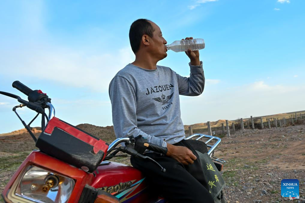 Dong Haining drinks water while patrolling a section of the Great Wall in north China, Aug. 20, 2023. Dong Haining, 42, has been a protector of the Great Wall since 2016. Over the years, he has patrolled a section of the Great Wall located in the Helan Mountains while clearing rubbish and weeds, and reminding tourists to preserve the wall. (Xinhua/Liu Jinhai)