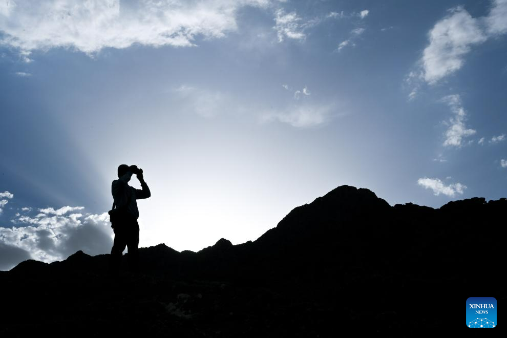 Dong Haining uses binoculars to observe a section of the Great Wall in north China, Aug. 20, 2023. Dong Haining, 42, has been a protector of the Great Wall since 2016. Over the years, he has patrolled a section of the Great Wall located in the Helan Mountains while clearing rubbish and weeds, and reminding tourists to preserve the wall. (Xinhua/Liu Jinhai)