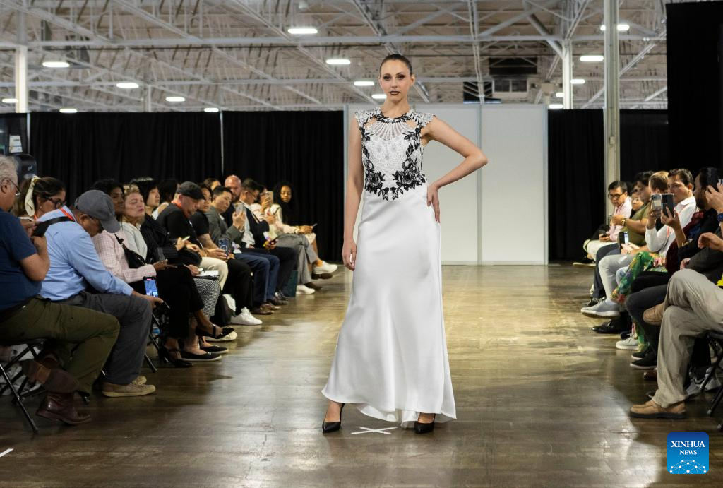 A model presents a creation during a Chinese brands fashion show at the 2023 Apparel Textile Sourcing Trade Show in Toronto, Canada, on Aug. 22, 2023. (Photo by Zou Zheng/Xinhua)