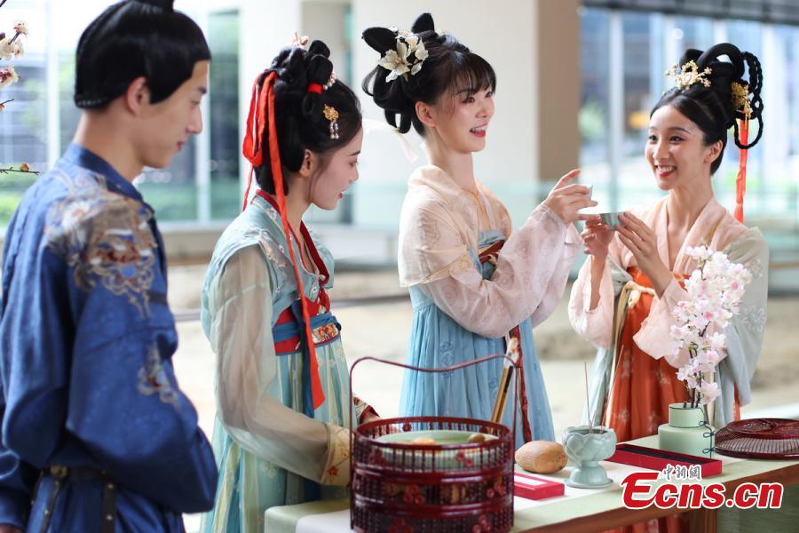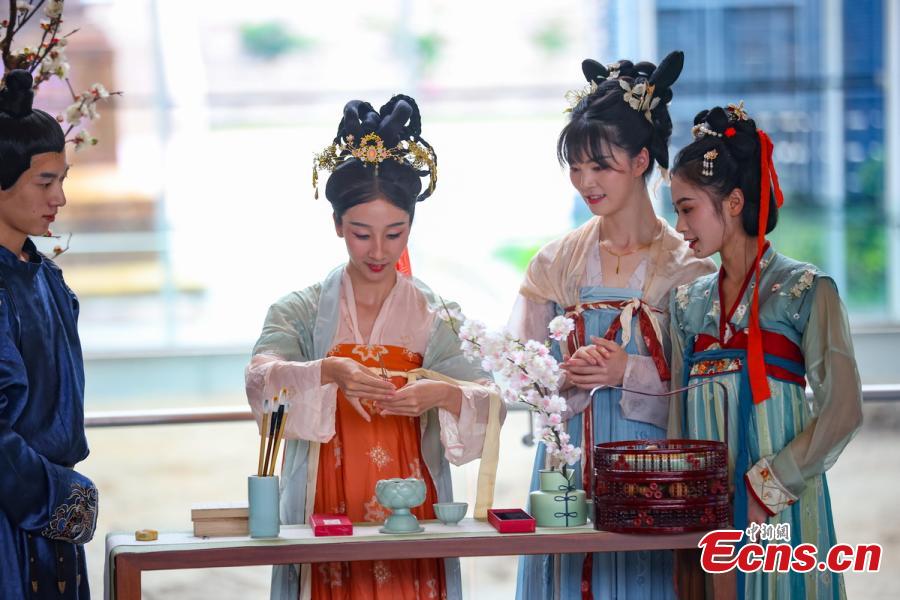 Artists in traditional Chinese costumes present folk customs of Qixi Festival in a museum at the Grand Baoen Temple Heritage and Scenic Area in Nanjing, east China's Jiangsu Province, Aug. 22, 2023. (Photo: China News Service/Yang Bo)