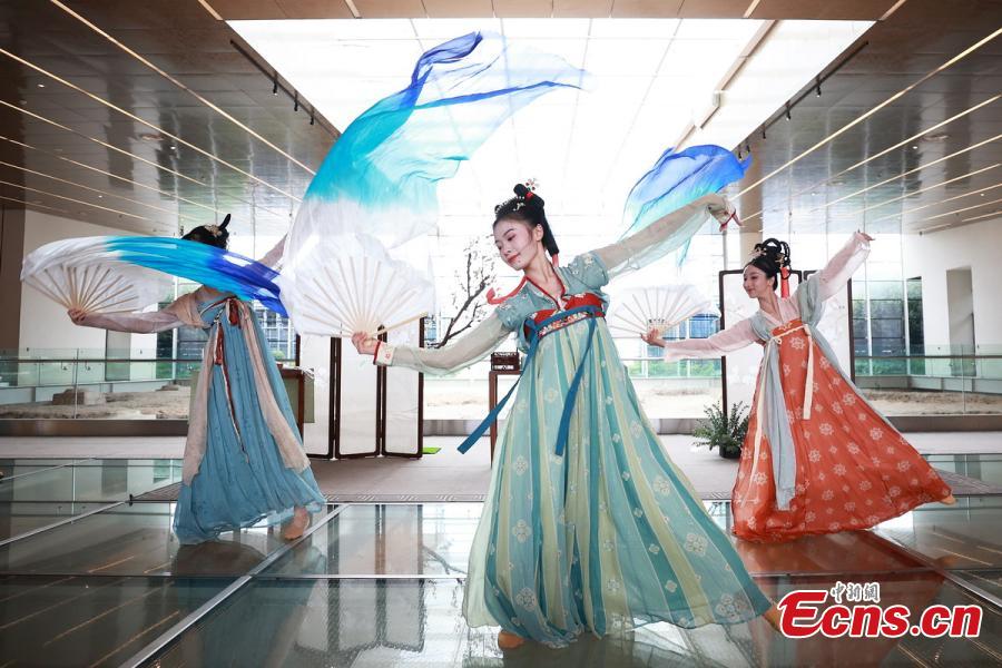 Artists in traditional Chinese costumes dance to present folk customs of Qixi Festival in a museum at the Grand Baoen Temple Heritage and Scenic Area in Nanjing, east China's Jiangsu Province, Aug. 22, 2023. (Photo: China News Service/Yang Bo)