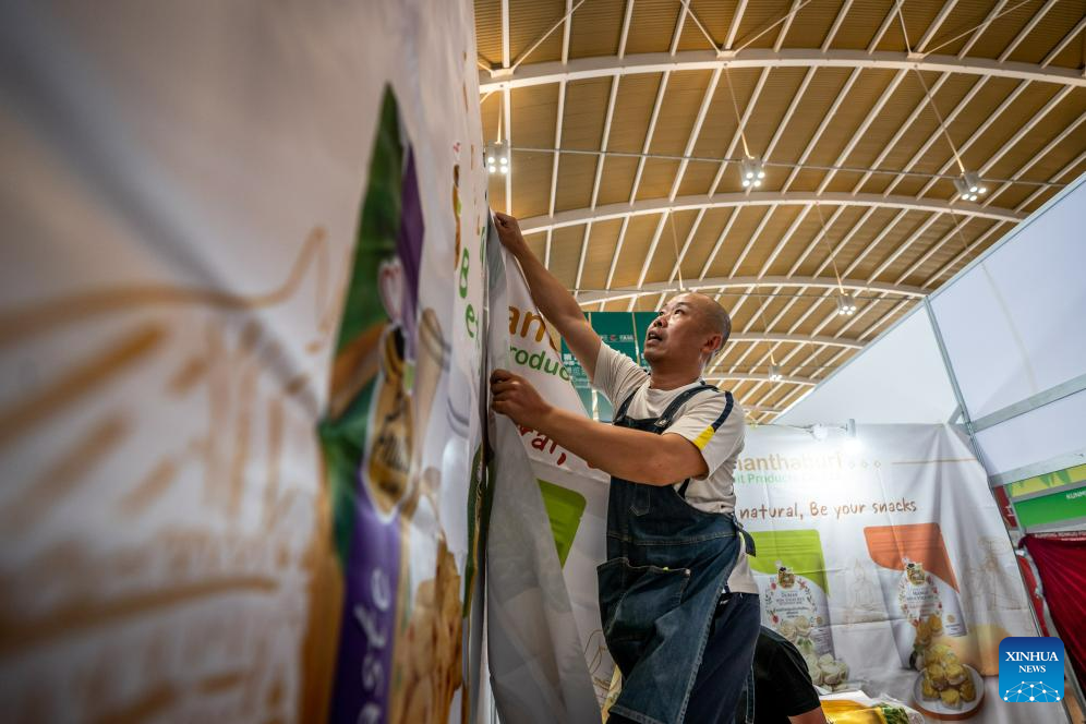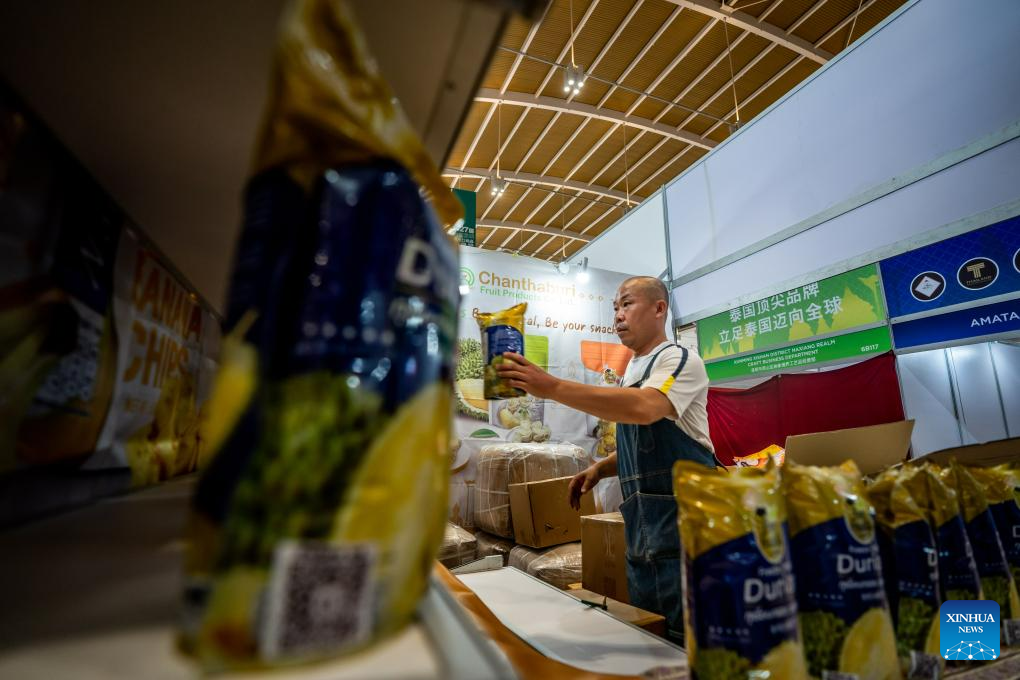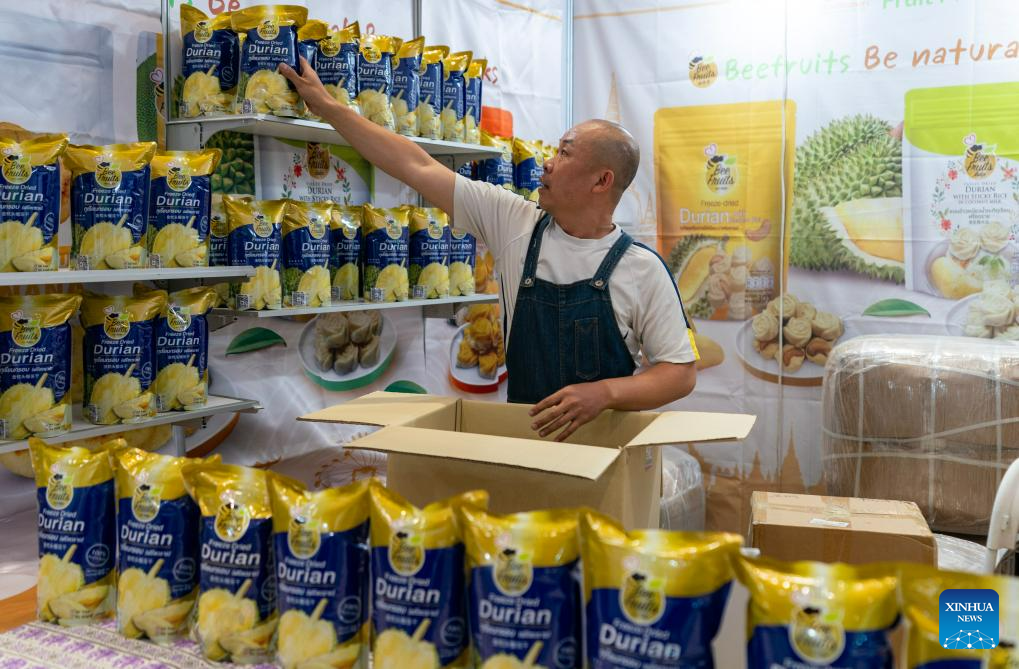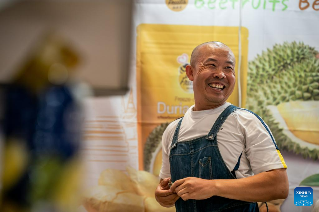 This photo taken on Aug. 14, 2023 shows Chen Jie arranging his freeze-dried durian products at his exhibition booth in Kunming Dianchi International Convention and Exhibition Center, the venue for the seventh China-South Asia Expo in Kunming, southwest China's Yunnan Province. (Xinhua/Hu Chao)