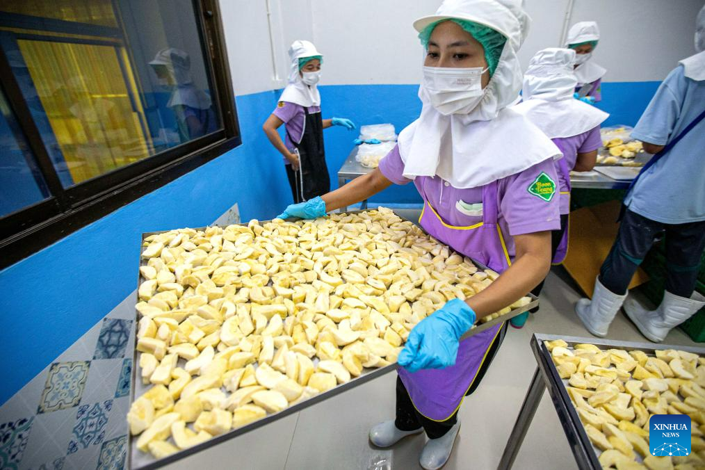 Staff members cut durian pulps at a fruit products company in Chanthaburi Province, Thailand, Aug. 17, 2023. (Xinhua/Wang Teng)