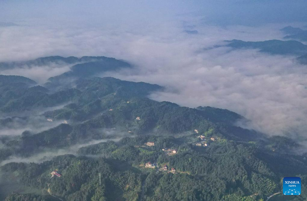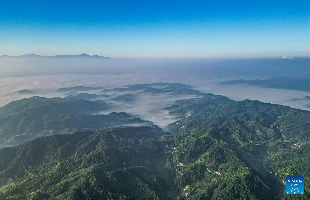 This aerial photo taken on Aug. 23, 2023 shows mountain scenery in Manshuihe Town of Lu'an City, east China's Anhui Province. (Xinhua/Guo Chen)
