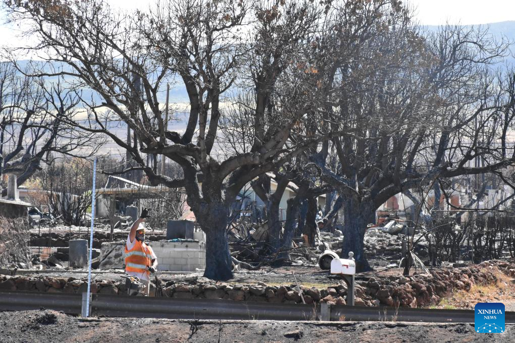 A worker is seen in fire-ravaged Lahaina town, Maui Island, Hawaii, the United States, Aug. 22, 2023. The death toll from the Maui wildfires in the U.S. state of Hawaii climbed to 115 as of Monday, according to a fatality update from the County of Maui. (Photo by Zeng Hui/Xinhua)