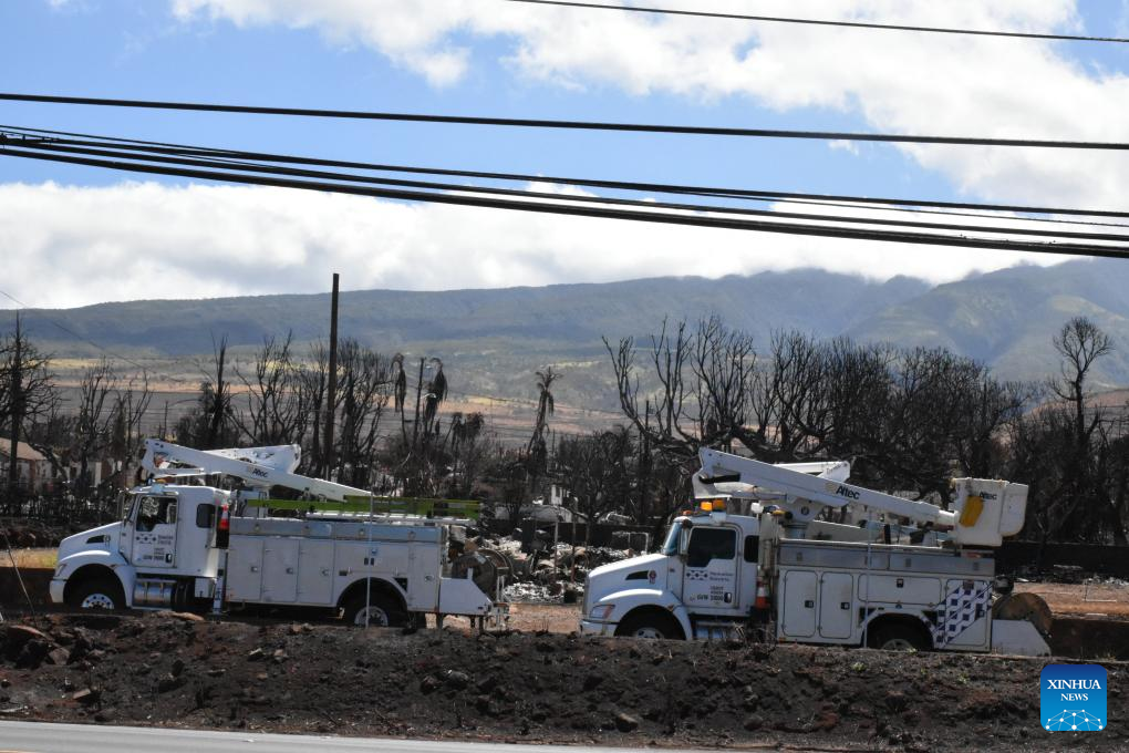 Engineered trucks are seen in fire-ravaged Lahaina town, Maui Island, Hawaii, the United States, Aug. 22, 2023. The death toll from the Maui wildfires in the U.S. state of Hawaii climbed to 115 as of Monday, according to a fatality update from the County of Maui. (Photo by Zeng Hui/Xinhua)