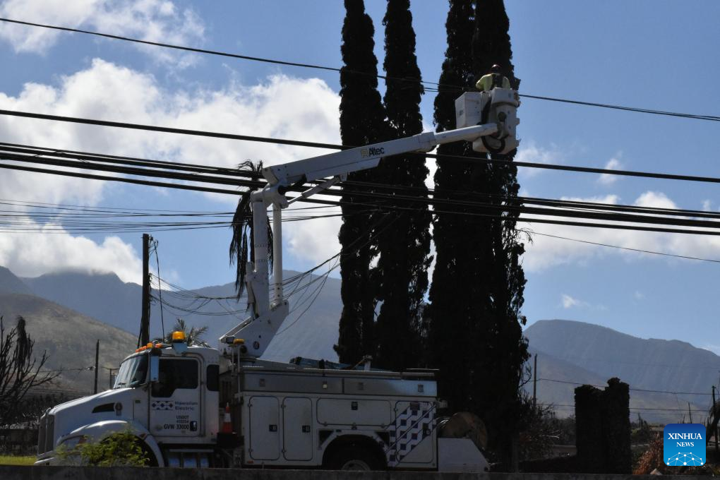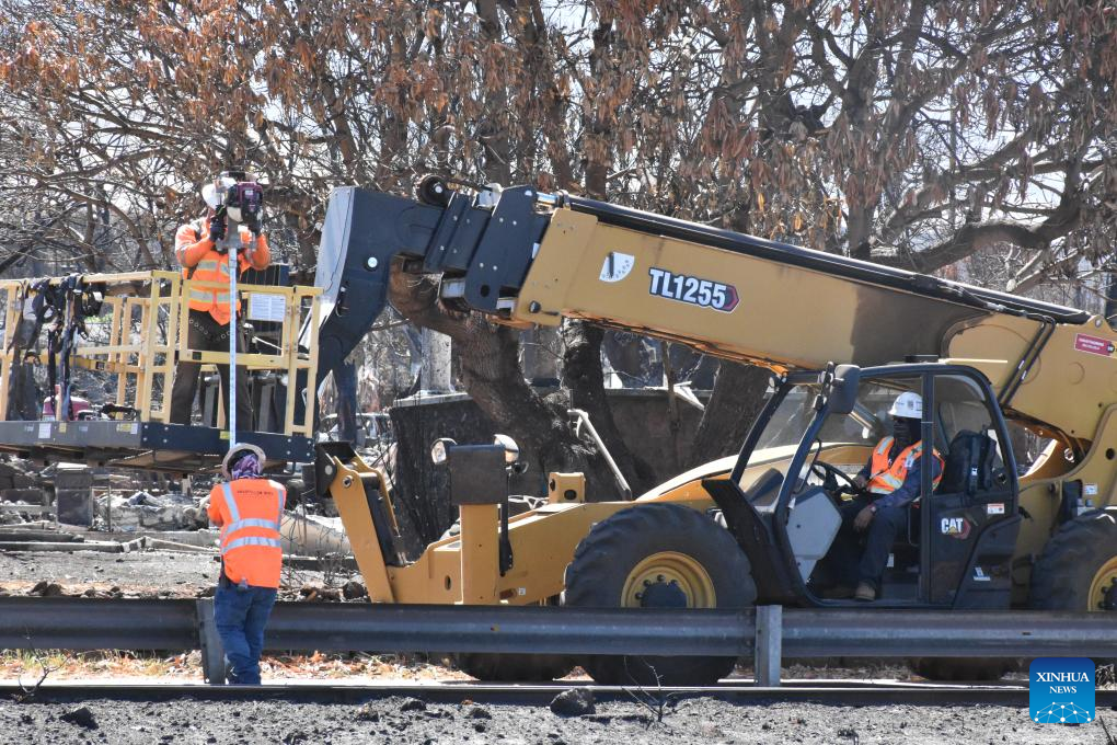Workers are seen in fire-ravaged Lahaina town, Maui Island, Hawaii, the United States, Aug. 22, 2023. The death toll from the Maui wildfires in the U.S. state of Hawaii climbed to 115 as of Monday, according to a fatality update from the County of Maui. (Xinhua/Gao Shan)