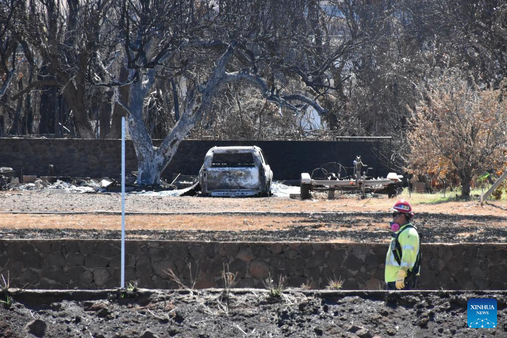 A worker is seen in fire-ravaged Lahaina town, Maui Island, Hawaii, the United States, Aug. 22, 2023. The death toll from the Maui wildfires in the U.S. state of Hawaii climbed to 115 as of Monday, according to a fatality update from the County of Maui. (Xinhua/Gao Shan)