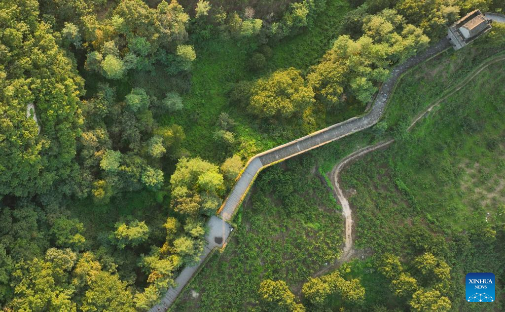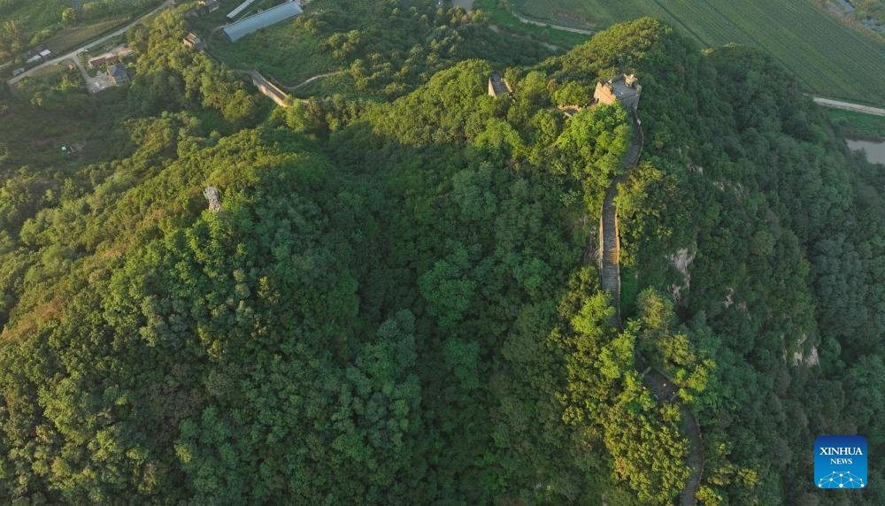 This aerial photo taken on Aug. 23, 2023 shows the scenery of Hushan section of the Great Wall in Dandong City, northeast China's Liaoning Province. (Xinhua/Yang Qing)